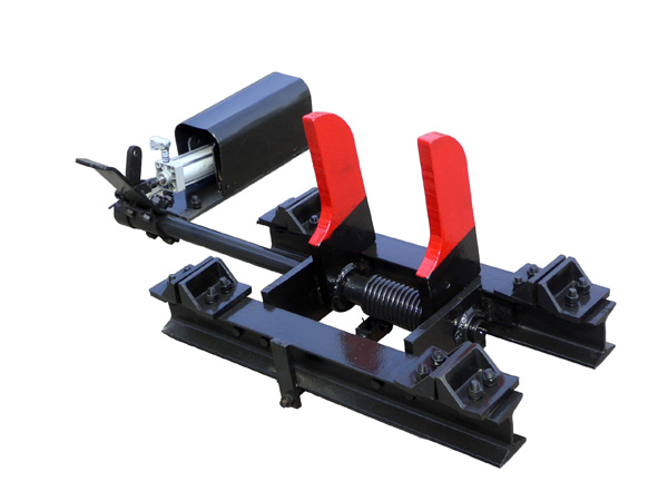 本實用新型公開了一種氣動阻車器,包括刀擋、扭簧、力把、氣缸、軸架、軸、限位板和拉桿,軸架固定在限位板上,軸的遠端穿過扭簧鉸接在軸架上,刀擋固定在軸上并與扭簧上端連接,扭簧下端固定在拉桿上,力把下端固定在軸的近端,力把上端與氣缸鉸接。該氣動阻車器結構簡單,安全可靠,可以人工控制,也可以遠程控制,實現集中自動化管理。